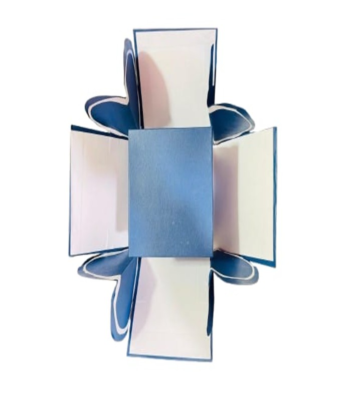 The box opens in a beautiful explosion style. When you remove the lid, three layers spread out in a cross shape. This creates an exciting and magical surprise. Every layer is neatly decorated and filled with delicious chocolates. The center space can include a special message, a photo, or a custom note to make your gift more personal.